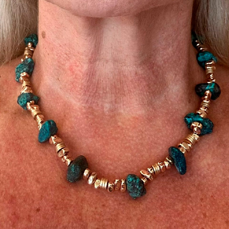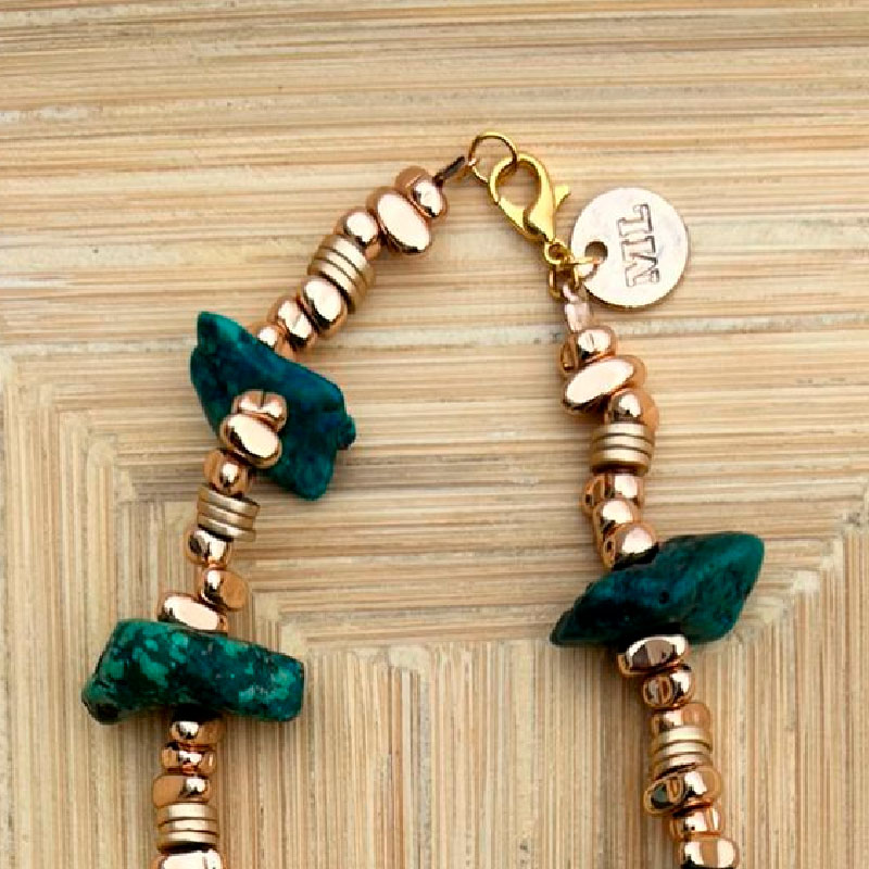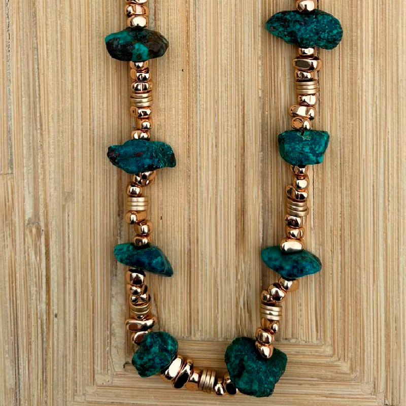 Colar curto com pedras brutas e hematitas com fecho banhado a ouro.